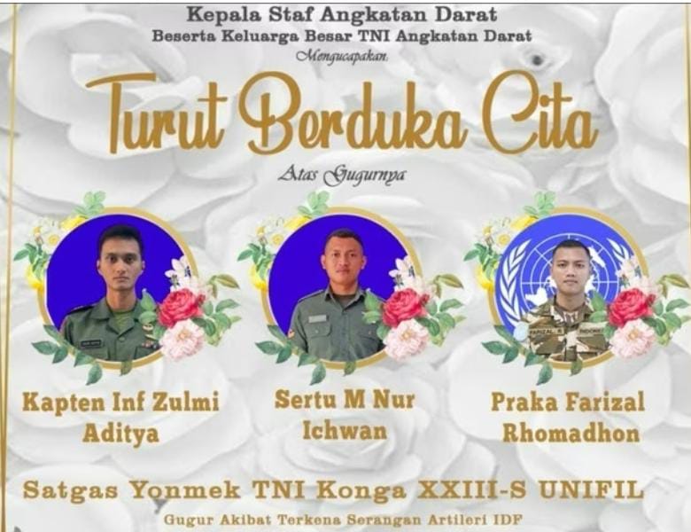 JAKARTA,FAKTAMERAH.COM — Tiga prajurit Tentara Nasional Indonesia (TNI) gugur saat menjalankan tugas sebagai Pasukan Perdamaian Perserikatan Bangsa-Bangsa dalam misi United Nations Interim Force in Lebanon (UNIFIL) di Lebanon. Kabar duka ini menjadi pengingat atas besarnya pengorbanan prajurit Indonesia dalam menjaga perdamaian dunia.