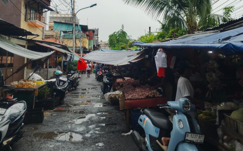 Jakarta Barat, faktamerah.com — Aktivitas pasar tradisional terlihat memanfaatkan badan jalan di Jalan Kali Anyar, Kecamatan Tambora, Jakarta Barat. Seperti tampak pada foto, lapak pedagang berdiri di sepanjang sisi jalan yang juga digunakan sebagai jalur lalu lintas warga dan kendaraan roda dua.