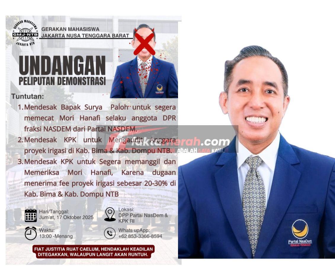 Faktamerah ( Jakarta ) – Aliansi Mahasiswa Nusa Tenggara Barat Se-Jakarta akan menggelar aksi unjuk rasa dan pelaporan resmi ke Komisi Pemberantasan Korupsi (KPK) serta Dewan Pimpinan Pusat Partai NASDEM (DPP NASDEM) pada Jumaat, 17 Oktober 2025, mendatang, terkait dugaan adanya praktik fee proyek irigasi di Kabupaten Bima dan Dompu, NTB, yang menyeret nama salah satu anggota DPR RI Komisi V Fraksi NASDEM Mori Hanafi. Senin 13/10/25.