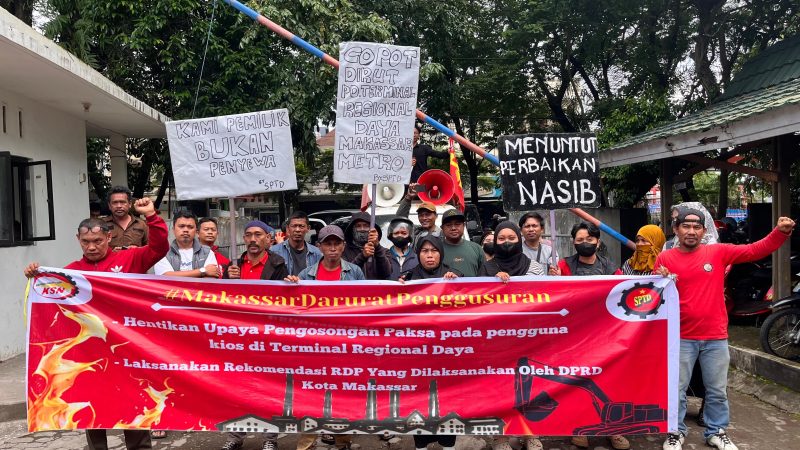 Dalam aksi itu, massa membawa spanduk dan poster bertuliskan “Makassar Darurat Penggusuran”. Para pedagang menyuarakan tuntutan agar Pemerintah Kota Makassar dan DPRD menghentikan kebijakan penertiban yang dianggap tidak berpihak kepada pedagang rakyat. Mereka menilai penggusuran kerap dilakukan tanpa dialog yang adil dan tanpa solusi relokasi yang layak.