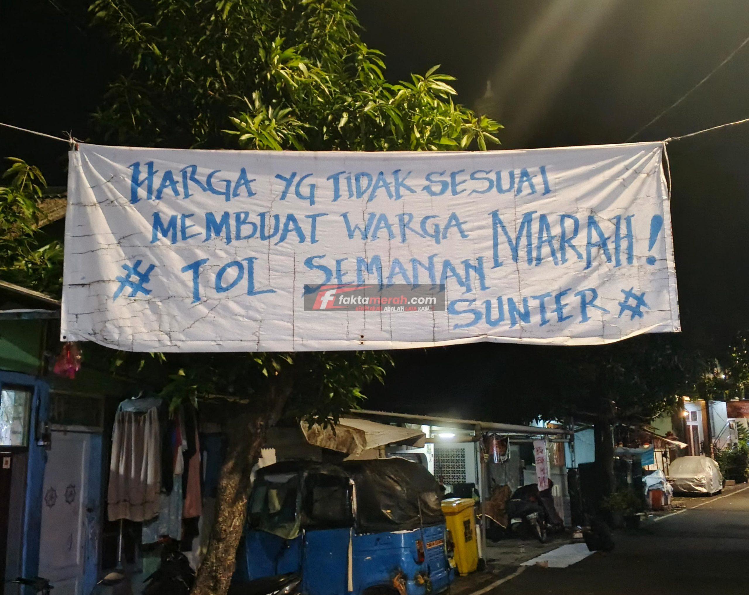 Spanduk penolakan warga RW 09 Kelurahan Duri Pulo, Kecamatan Gambir, Jakarta Pusat, terkait nilai ganti rugi proyek Tol Semanan–Sunter terpasang di lingkungan permukiman warga, sebagai bentuk protes dan tuntutan keadilan.